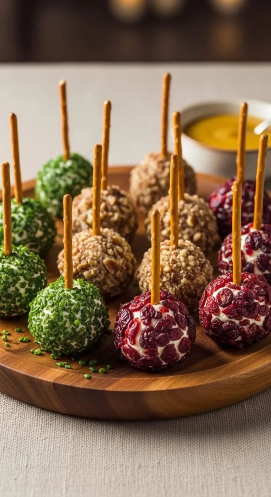 Turn the classic cheese ball into a one-bite wonder. Mix cream cheese, shredded cheddar, and a bit of garlic powder. Roll into small balls and coat with crushed nuts or parsley. Pop a pretzel stick in each for easy serving. They’re creamy, crunchy, and disappear fast—especially next to a glass of mulled wine.
