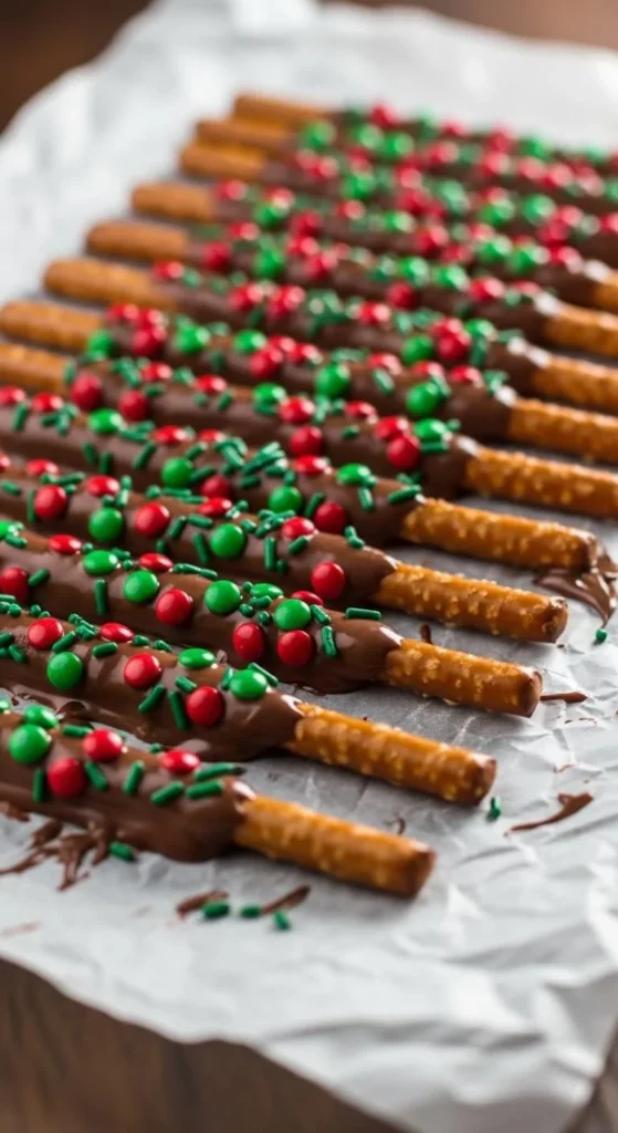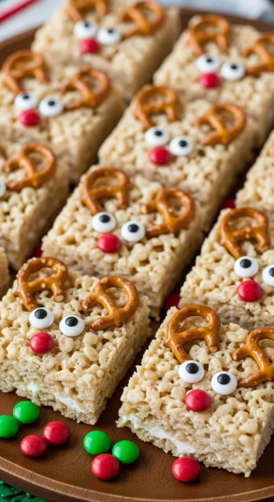 Make classic Rice Krispie treats, cut into rectangles, and add pretzels for antlers. Use candy eyes and red M&Ms for Rudolph noses. They’re festive, quick, and great for kids’ parties. Plus, they can double as edible decorations for your dessert table.