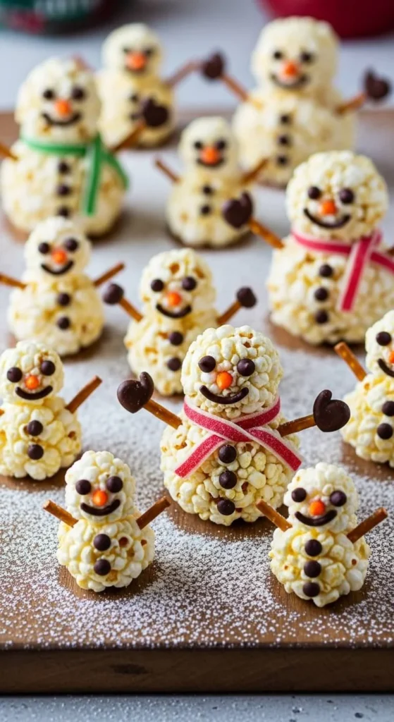 Combine popped popcorn with melted marshmallows, shape into balls, and let cool. Add pretzel stick arms and chocolate chip eyes. They’re fun for kids to make and even more fun to eat. Wrap them in cellophane for a cute edible gift idea.