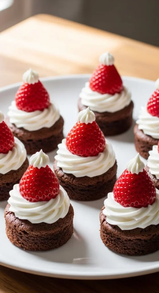 Bake mini brownies or use store-bought ones. Add a swirl of whipped cream and top with a strawberry cap. A small dot of cream on top finishes the look. These are adorable for dessert trays and disappear before the plate hits the table.